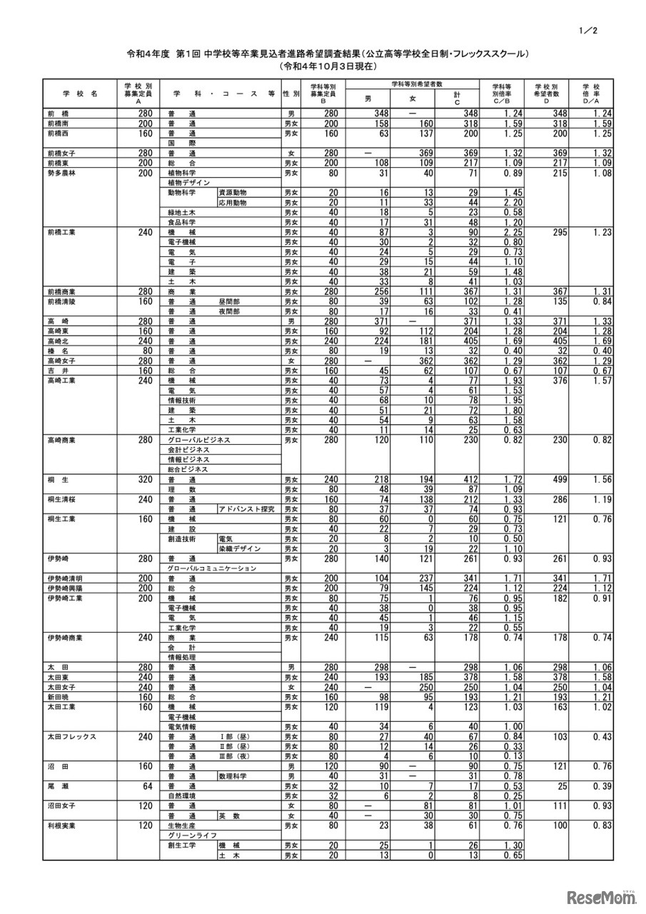 群馬県教育委員会は2022年10月20日、2022年度(令和4年度)第1回「中学校等卒業見込者進路希望調査結果」を公表した。県内公立高校の全日制・フレックススクールへの進学希望者は1万2,463人で、倍率は1.05倍だった。