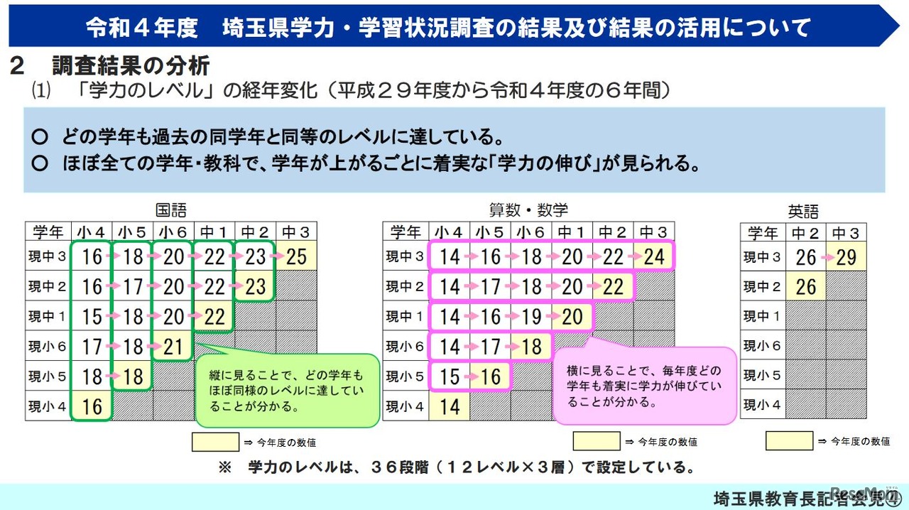 埼玉県教育委員会は2022年10月21日、2022年度埼玉県学力・学習状況調査の結果等について発表した。コロナ禍においても小中学生の各教科の「学力のレベル」は、過去の同学年と同様のレベルに達し、学年が上がるごとに着実な「学力の伸び」がみられることがわかった。