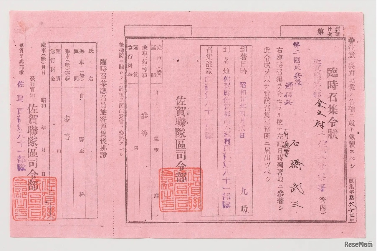 画像出典:平和祈念展示資料館 臨時召集令状(赤紙) 平和祈念展示資料館所蔵