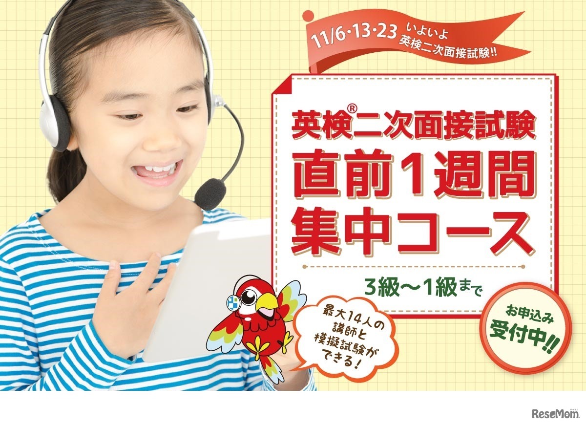 オンライン英会話ENC/GNAは11月に実施される英検の二次面接に向け、「英検二次面接試験対策直前1週間集中コース」を開講する。1レッスン25分を1日2回・1週間(計14レッスン)受講可能。受講料は1万円(税込)。体験レッスンは1回無料。