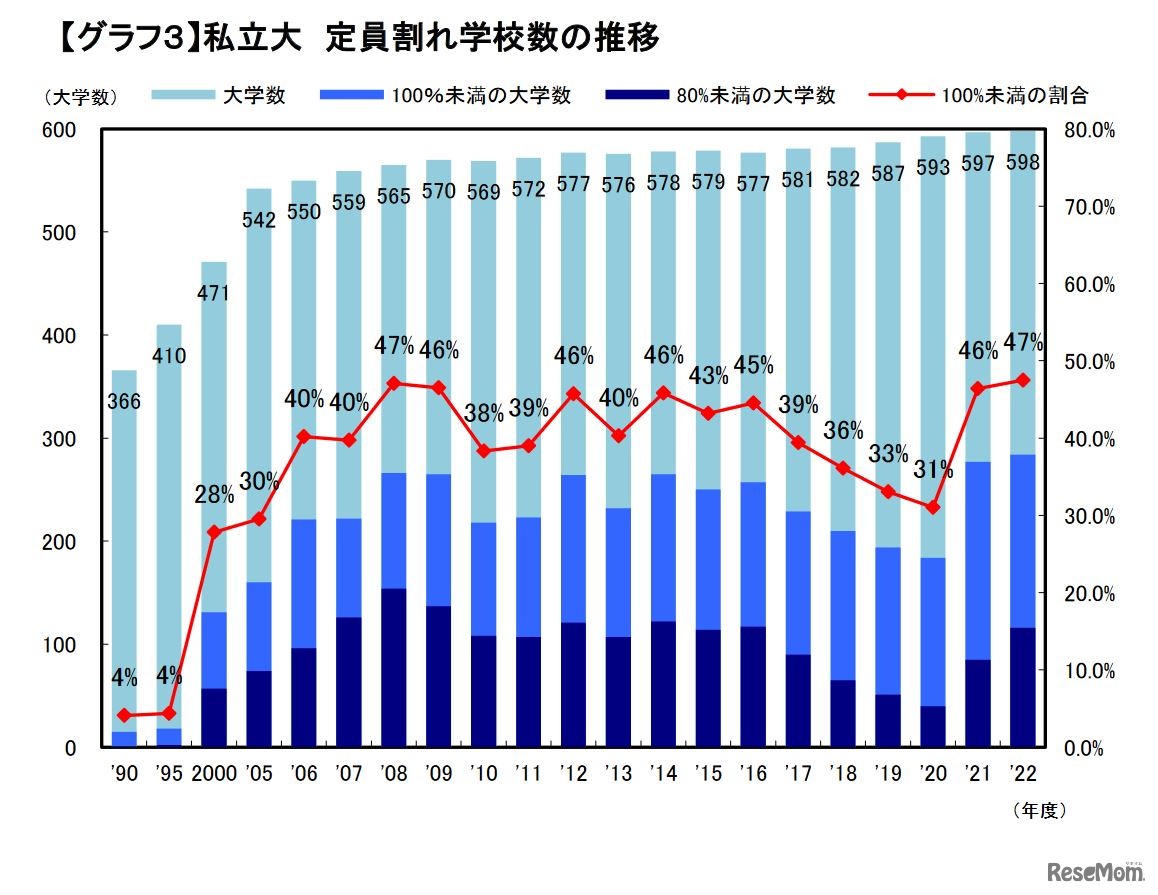 河合塾は2022年10月20日、大学入試情報サイト「Kei-Net」の入試・教育トピックスに「私立大 定員割れ大学の増加続く」を掲載した。定員割れの私立大学が過去最高の47.5%となった2022年度入試を振り返り、大学規模別の定員充足率、学部系統別の動向等をまとめている。
