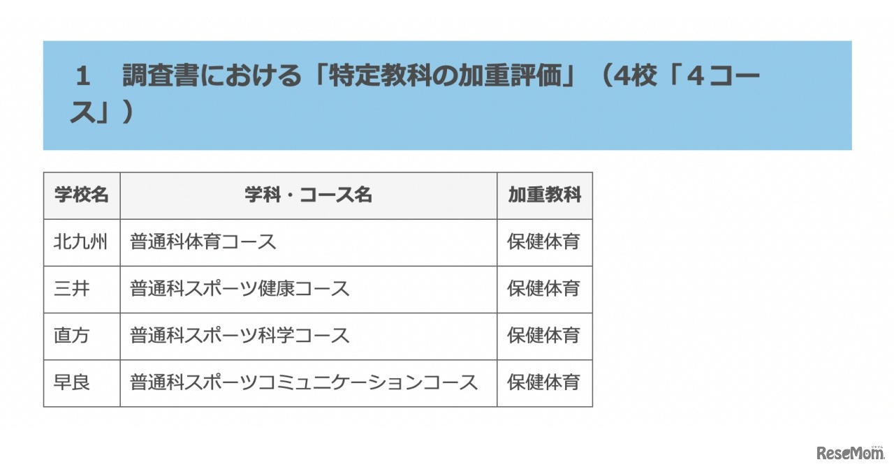 福岡県は2022年10月19日、2024年度(令和6年度)県立高等学校入学者選抜における「特定教科の加重評価」および「特定教科の加重配点」の実施校一覧を公表した。「特定教科の加重評価」は4校4コース、「特定教科の加重配点」は12校10学科3コースが実施する。