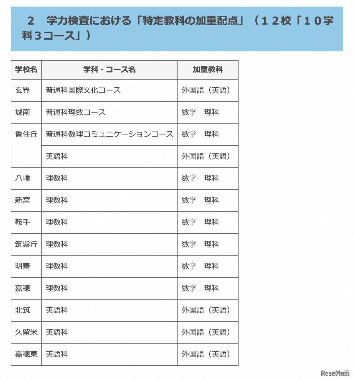 福岡県は2022年10月19日、2024年度(令和6年度)県立高等学校入学者選抜における「特定教科の加重評価」および「特定教科の加重配点」の実施校一覧を公表した。「特定教科の加重評価」は4校4コース、「特定教科の加重配点」は12校10学科3コースが実施する。