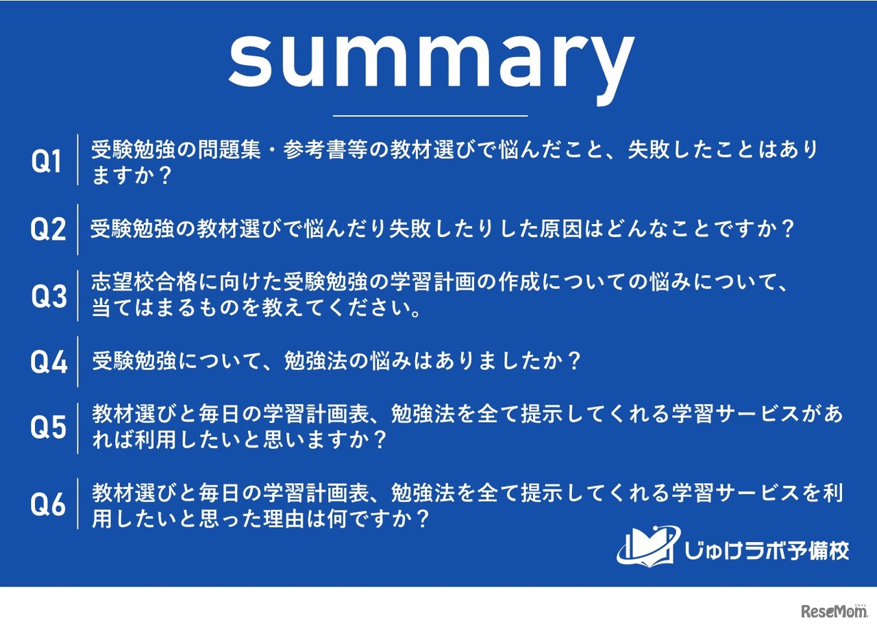 じゅけラボ予備校は、高校受験を経験した16~19歳の男女を対象に、高校受験勉強に関する悩みの実態調査を実施した。教材選びで悩んだり失敗したりしたことがある人は65.5%、学習計画と勉強法では8割以上もの受験生が悩みを抱えていたことが明らかとなった。
