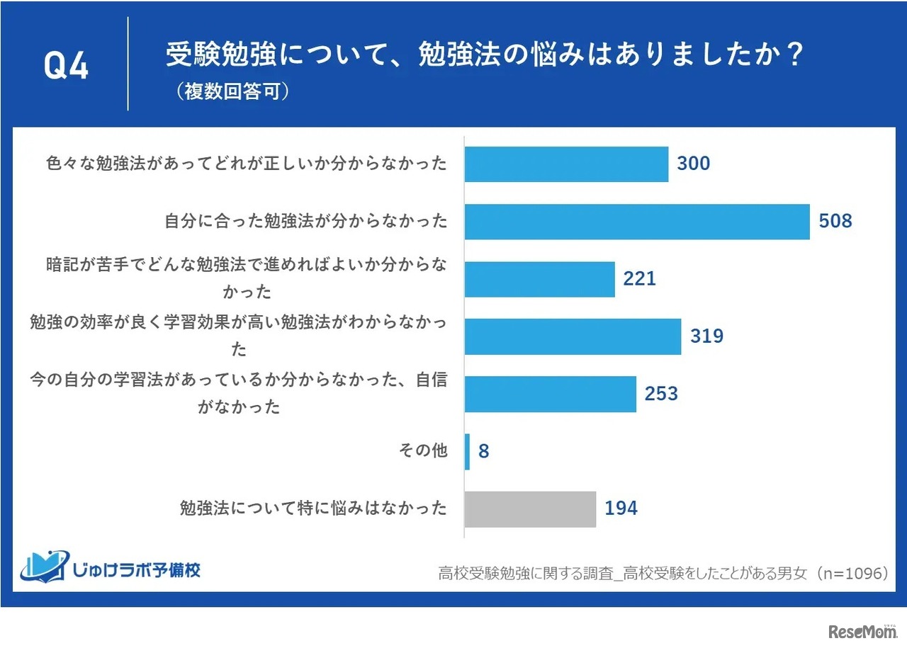 じゅけラボ予備校は、高校受験を経験した16~19歳の男女を対象に、高校受験勉強に関する悩みの実態調査を実施した。教材選びで悩んだり失敗したりしたことがある人は65.5%、学習計画と勉強法では8割以上もの受験生が悩みを抱えていたことが明らかとなった。