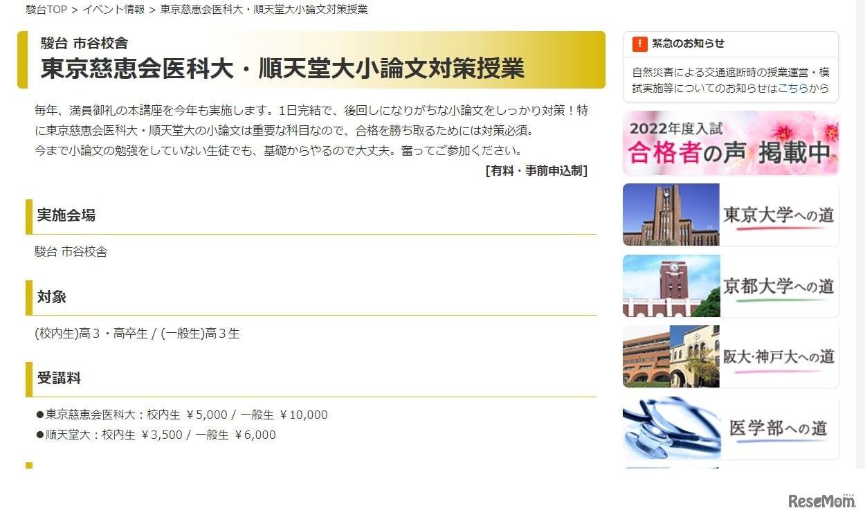 駿台 市谷校舎は2022年11月13日、高校3年生(駿台校内生は高卒生も可)を対象に、東京慈恵会医科大学と順天堂大学の小論文対策授業を実施する。事前申込制。受講料は駿台校内生3,500円~、一般生6,000円~。