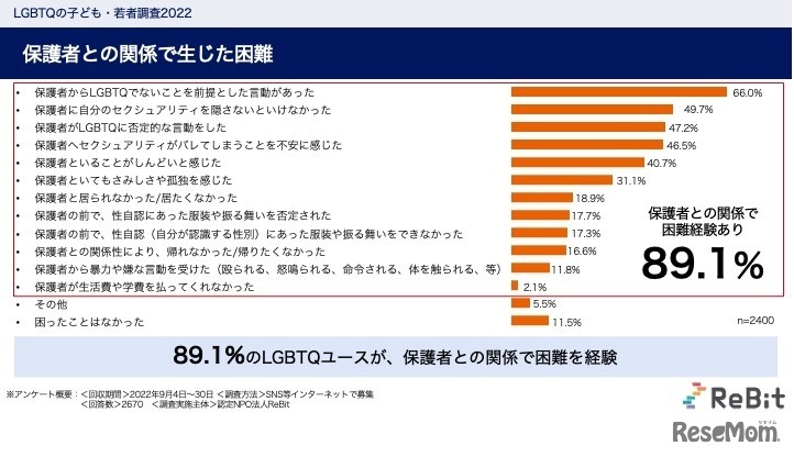 ReBitは「LGBTQ子ども・若者調査2022」を実施し、速報を公開した。全国調査と比較し、高校生の不登校経験は10倍にものぼるが、9割超が教職員・保護者に安心して相談できていない実態が明らかになった。