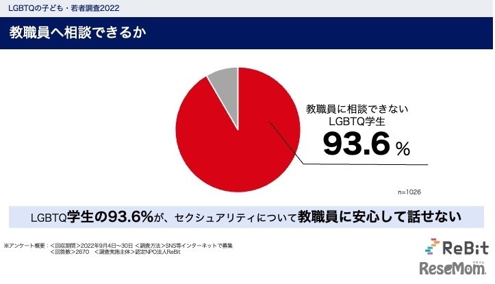 ReBitは「LGBTQ子ども・若者調査2022」を実施し、速報を公開した。全国調査と比較し、高校生の不登校経験は10倍にものぼるが、9割超が教職員・保護者に安心して相談できていない実態が明らかになった。