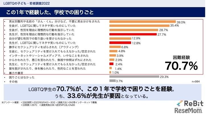ReBitは「LGBTQ子ども・若者調査2022」を実施し、速報を公開した。全国調査と比較し、高校生の不登校経験は10倍にものぼるが、9割超が教職員・保護者に安心して相談できていない実態が明らかになった。