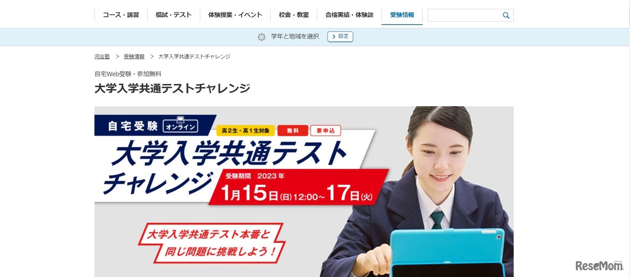 河合塾は2023年1月15日から1月17日、高校1・2年生を対象に、大学入学共通テストの実施後すぐにWebにて同じ問題にチャレンジできる「大学入学共通テストチャレンジ」を実施する。申込みは2023年1月6日午後3時まで。参加無料。