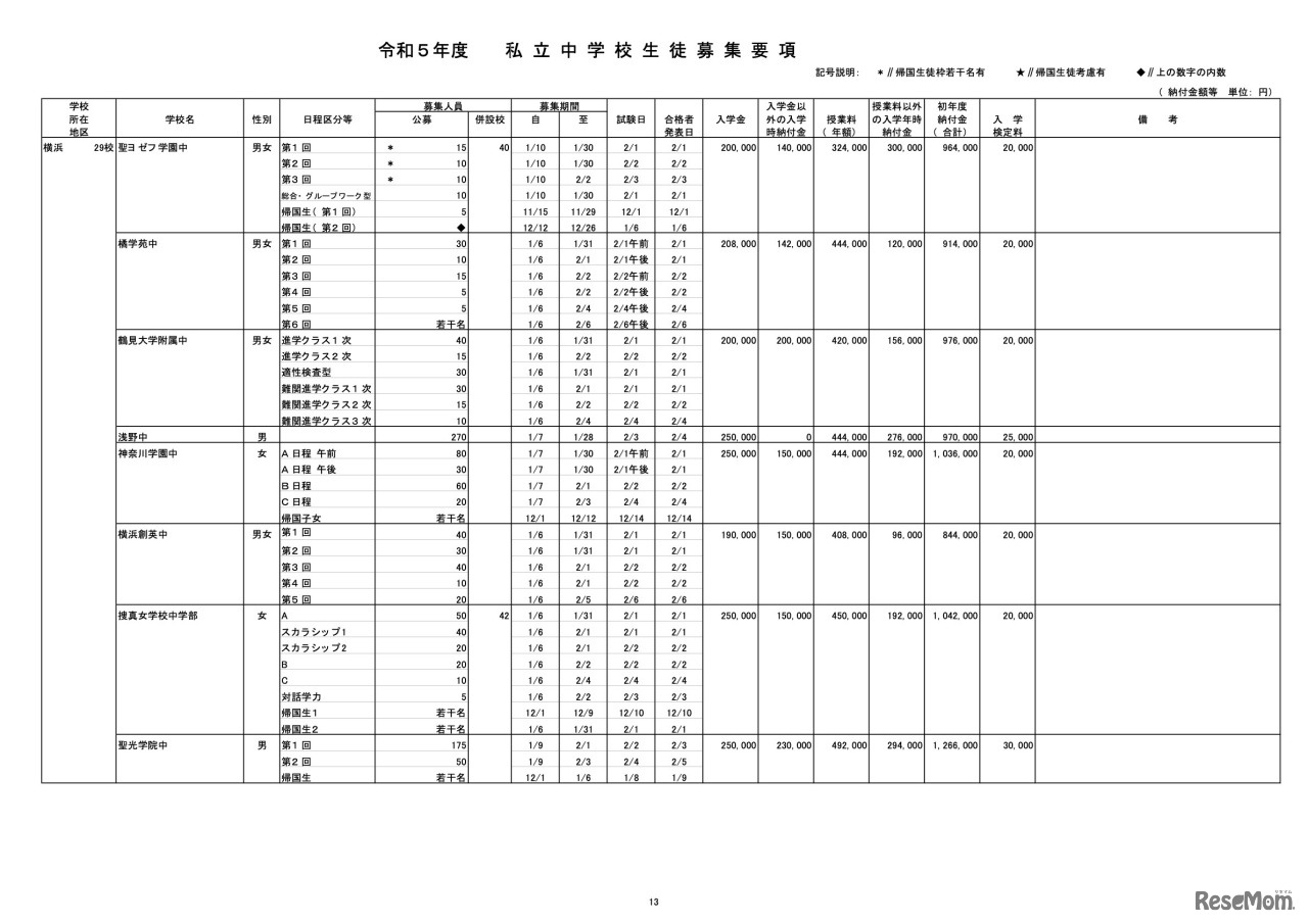 画像出典:神奈川県私立中学高等学校協会 令和5年度 私立中学校生徒募集要項(一部)