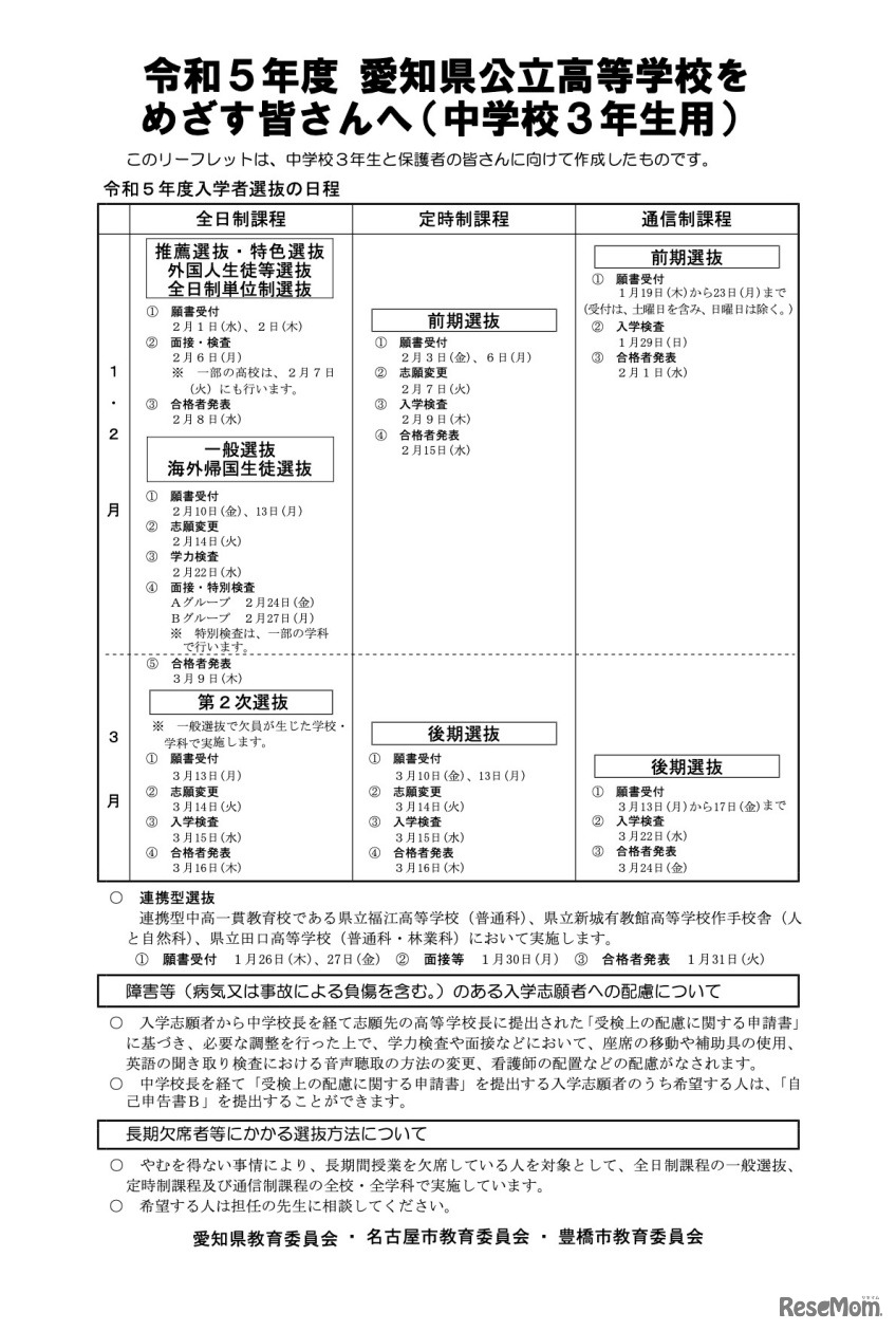 愛知県教育委員会は、中学3年生向けのリーフレット「令和5年度(2023年度)愛知県公立高等学校をめざす皆さんへ」をWebサイトに公開した。入学者選抜日程の他、推薦選抜の基準等について掲載している。