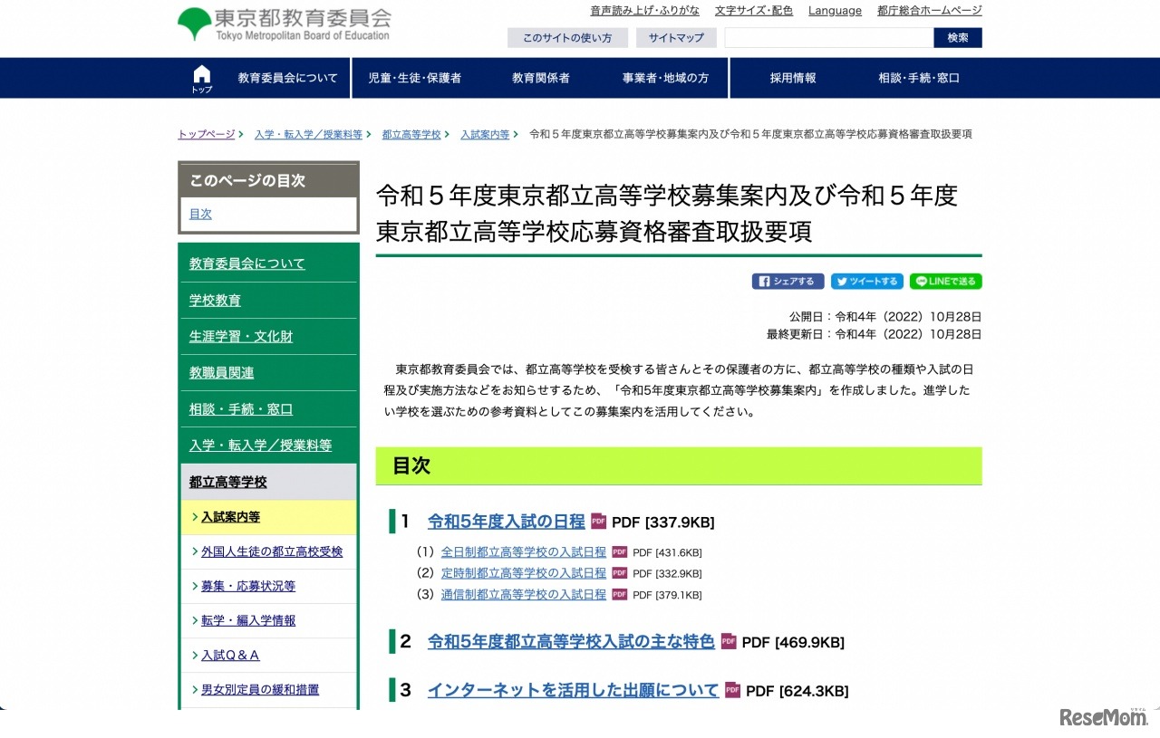 東京都教育委員会は2022年10月28日、「2023年度(令和5年度)東京都立高等学校募集案内」を公表した。都立高校を目指す受検生とその保護者に向けて、都立高等学校の種類や入試の日程、実施方法等をまとめて掲載。進学したい学校選びの参考資料として活用を勧めている。