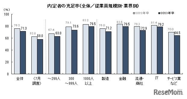 ディスコは、全国の主要企業を対象に、正式内定解禁を迎えるタイミングでの採用活動の進捗や23卒採用の内定充足状況、24年卒者の採用等について予定や方針を尋ねた。内定充足率は前年同期を下回る71.3%、内定辞退も前年度より増え、企業の苦戦ぶりが目立つ結果となった。