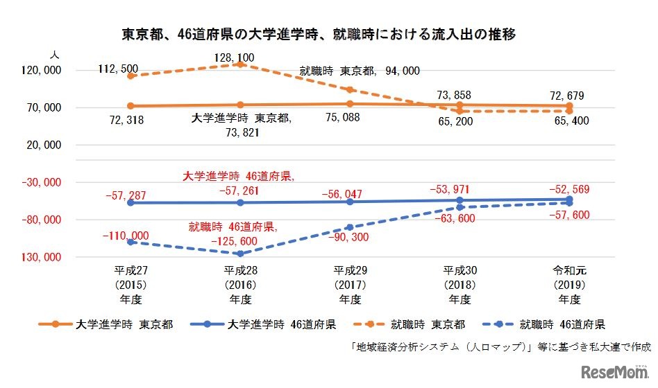 東京都、46道府県の大学進学時、就職時における流入出の推移