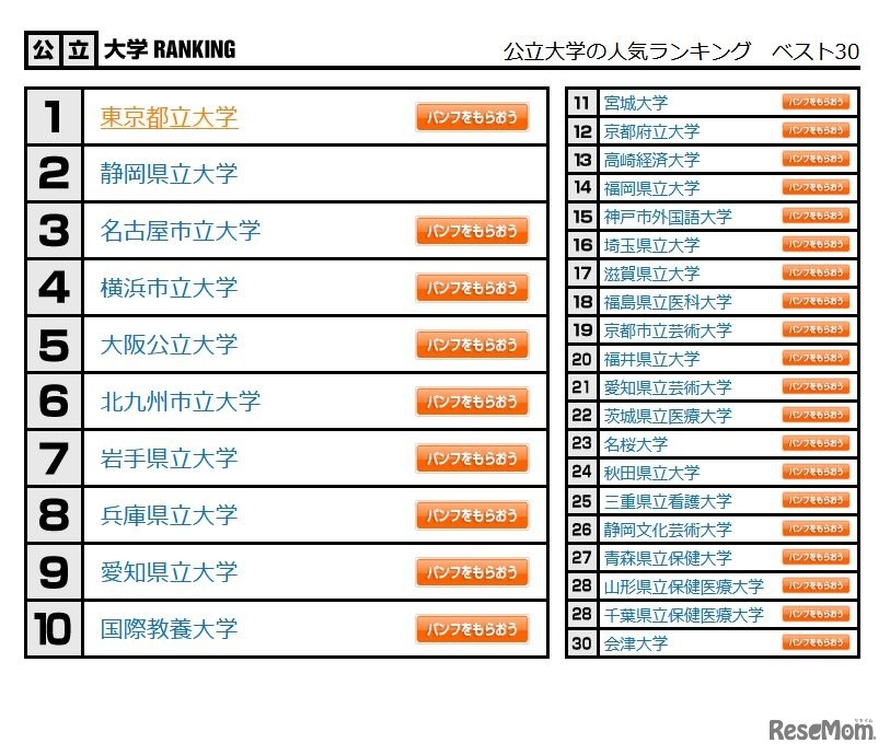 画像出典:JSコーポレーション 公立大学の人気ランキング ベスト30