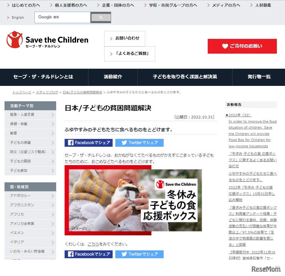 子供支援専門の国際NGOセーブ・ザ・チルドレン・ジャパンは、経済的に困難な状況にある家庭を対象に「冬休み子どもの食応援ボックス」を提供する。申込受付は2022年11月10日まで。