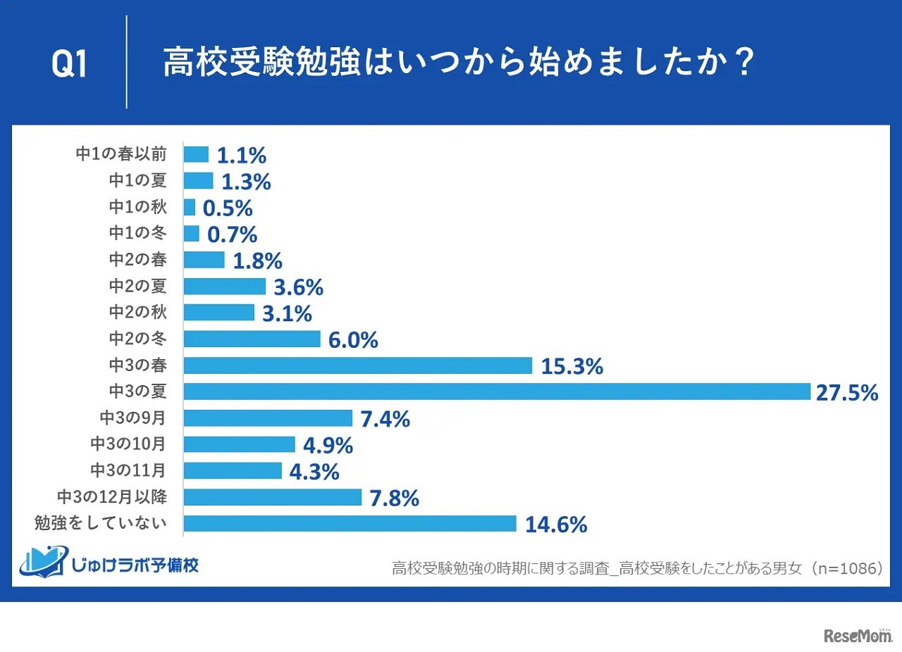 16~19歳の男女に高校受験勉強を始めるのに最適な時期を聞いたところ、半数以上が「中3より前」と答えたことが2022年11月2日、じゅけラボ予備校の調査でわかった。一方、実際に高校受験勉強をスタートした時期は7割近くが「中3以降」と回答した。