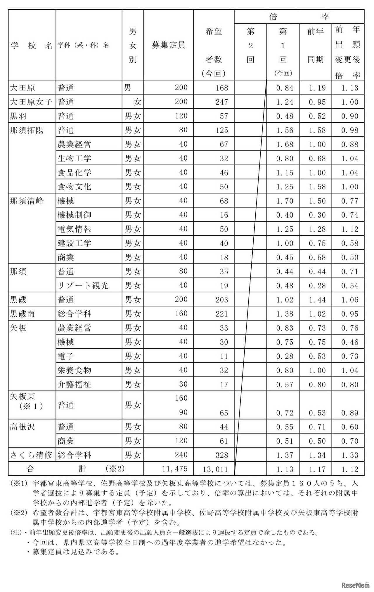 栃木県は2022年11月4日、2022年度(令和4年度)中学校等生徒の進路希望調査(第1回・10月1日現在)の結果を公表した。進路希望の倍率では、宇都宮中央(普通)2.42倍、宇都宮工業(建築デザイン)2.35倍等が高い。