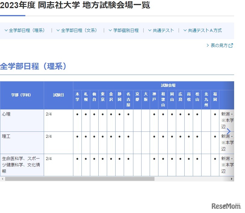 画像出典:河合塾Kei-Net 2023年度同志社大学 地方試験会場一覧(一部)