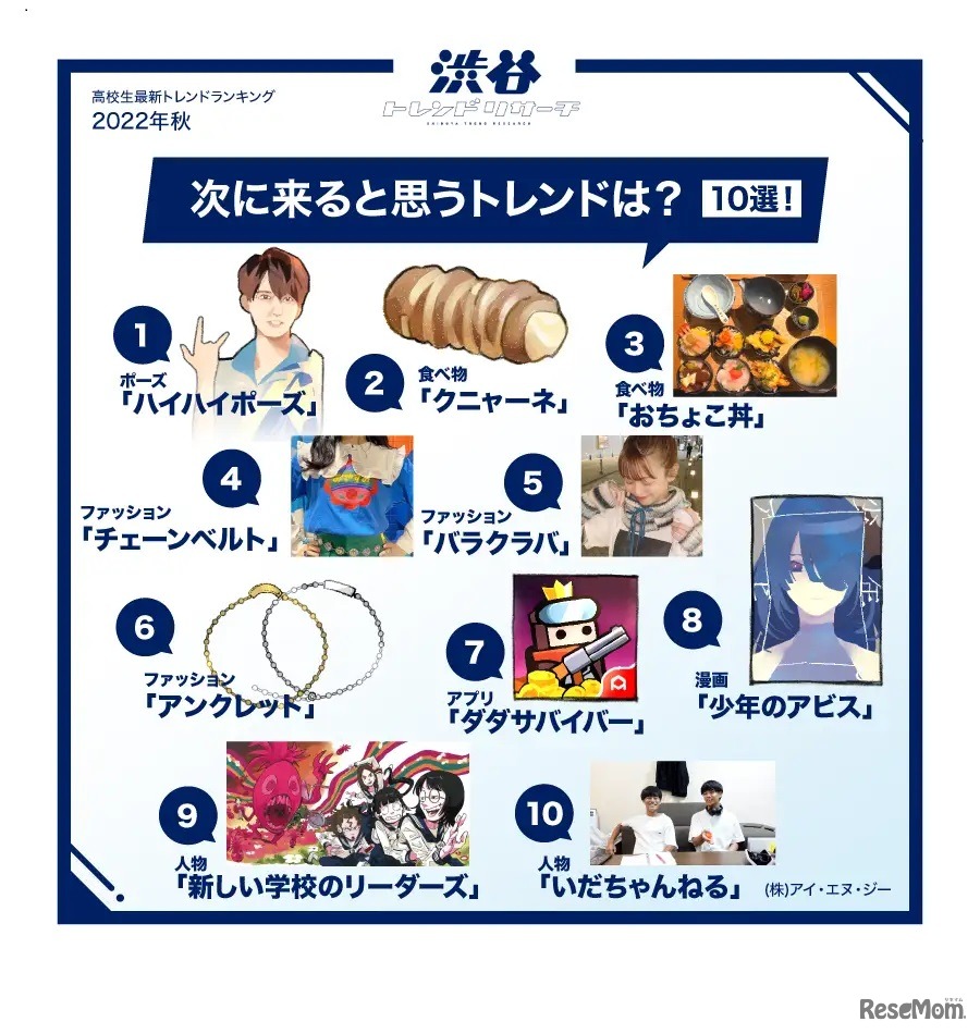 アイ・エヌ・ジーは、流行に敏感な関東の高校生男女100名に「2022年秋の最新トレンド」調査を実施した。流行りの言葉、物事、好きな芸能人やインフルエンサーの他、流行りのポーズ等をランキング形式で発表。2023年に流行る物事も予想している。