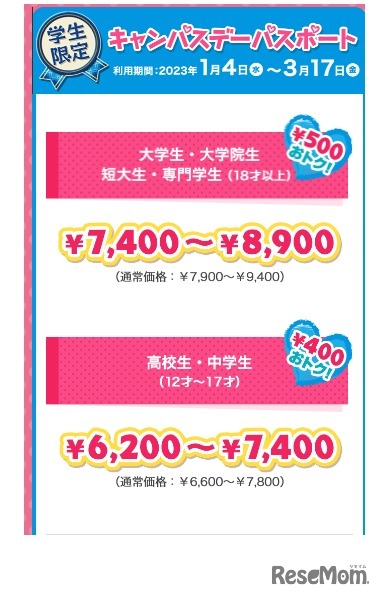 オリエンタルランドは、大学生や中高生ら学生を対象にした割引チケット「キャンパスデーパスポート」を販売する。2023年1月4日から3月17日の期間、東京ディズニーランドか東京ディズニーシーで使える。
