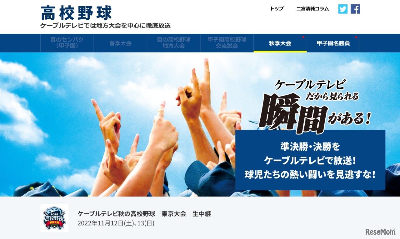 東京都内ケーブルテレビ8社とジェイ・スポーツ(J SPORTS)は、2022年11月12日と13日に行われる「2022年度秋季東京都高等学校野球大会(秋季東京都大会)」の準決勝および決勝戦を生中継する。
