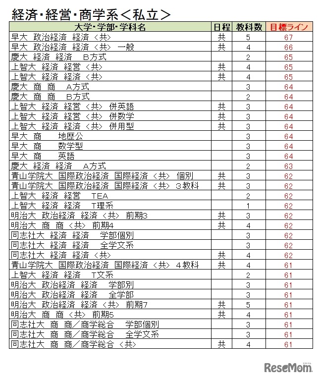 画像:駿台予備学校の情報をもとにリセマム編集部作成 大学別合格目標ライン<私立>経済・経営・商学系