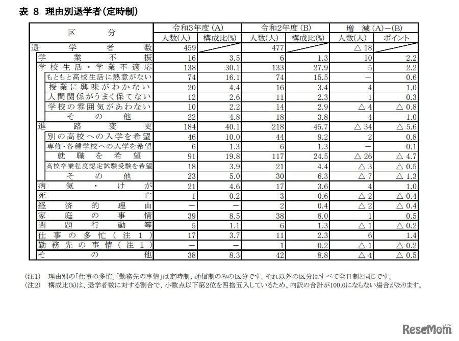 神奈川県は、県内の公立高等学校等生徒の2021年度(令和3年度)における転・編入者、転出者、退学者、長期欠席者等の状況を公表した。退学の理由としてもっとも多かったのは「進路変更」であること等が明らかになった。