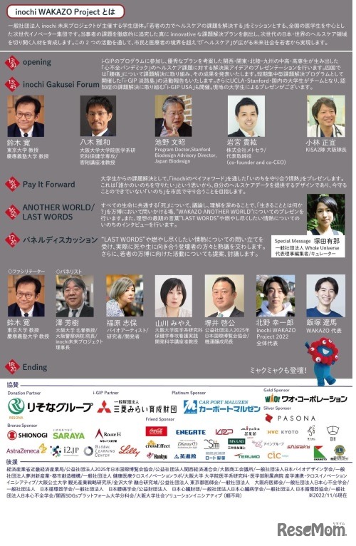 inochi 未来プロジェクトと学生支部inochi WAKAZO Projectは2022年11月20日、「inochi WAKAZO Forum 2022~情熱で、いのちを輝かそう。~」を大阪市の中之島会館にて開催、YouTube配信する。中高生・高専生・大学生が医療や生きること、未来について語る。