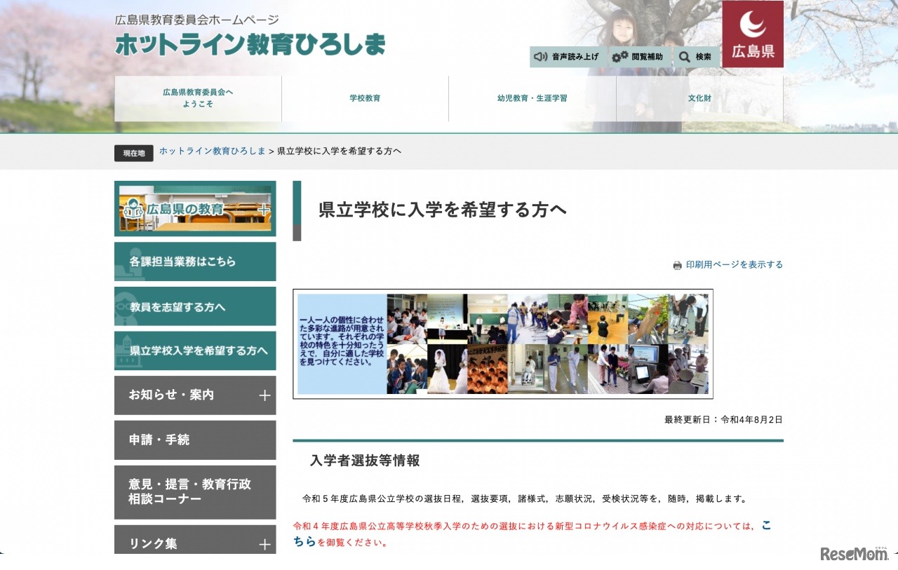 広島県教育委員会は2022年11月1日発行のWeb版広報誌「くりっぷ79号」にて、2023年度広島県公立高等学校入学者選抜よりすべて「インターネット出願」にすると発表した。あわせてQ&Aも公開。11月中旬にはテストサイトを公開し、導入初年度のスムーズな運用に備える。