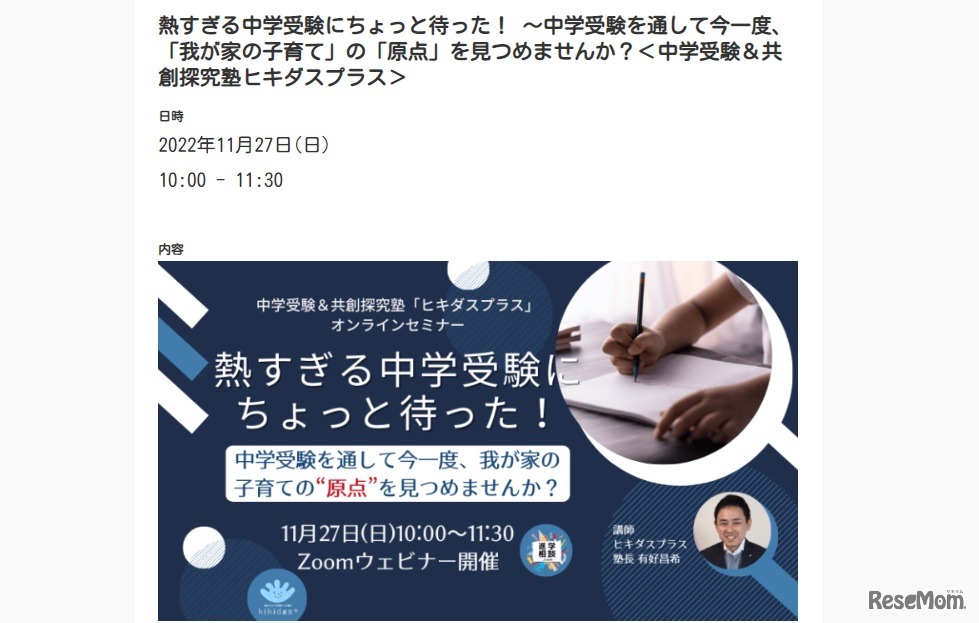 共創探究型中学受験塾「ヒキダスプラス」は2022年11月27日、オンラインセミナー「熱すぎる中学受験にちょっと待った!~中学受験を通して今一度、我が家の子育ての『原点』を見つめませんか?」を開催する。参加費は無料。