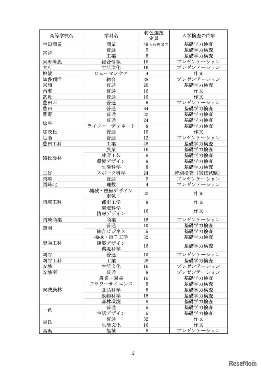 愛知県教育委員会は2022年11月17日、2023年度(令和5年度)入学者選抜から新たに導入する特色選抜の定員について公表した。実施全校の特色選抜定員と検査内容を一覧で掲載。定員は、岡崎(普通)5人、刈谷(普通)10人等。