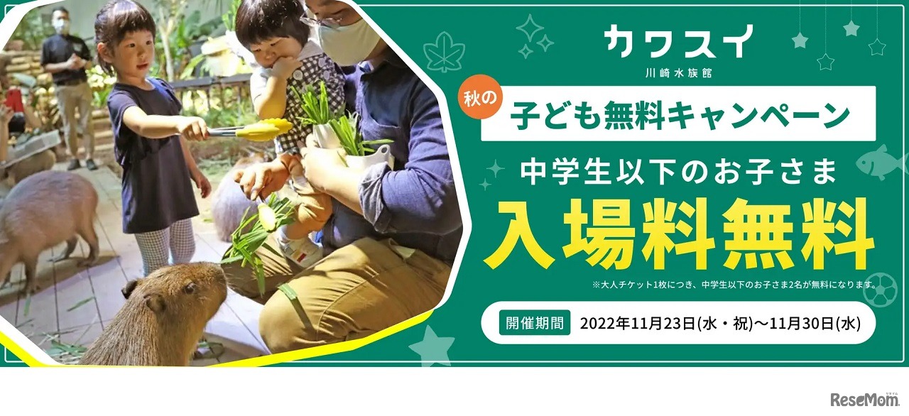 カワスイ(川崎水族館)は、2022年11月23日から11月30日まで、「カワスイ 子供無料キャンペーン」を実施する。期間中、大人(大人料金の入館チケットを持つ人)1人につき、中学生以下の子供2人まで入館料金が無料となる。期間中何度でも利用可能。