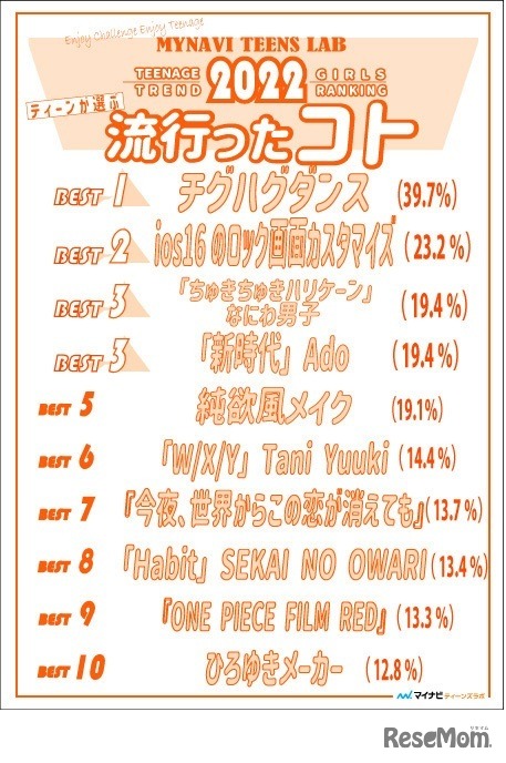 マイナビティーンズラボは2022年11月16日、「2022年ティーンが選ぶトレンドランキング」を発表した。ヒト部門の1位は「平成フラミンゴ」。コト部門1位は「チグハグダンス」、コトバ部門1位は「それでは聞いてください、チグハグ」が選ばれた。