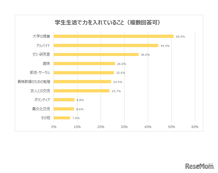 学生生活で力を入れていることは「大学の授業」が50.9%で最多