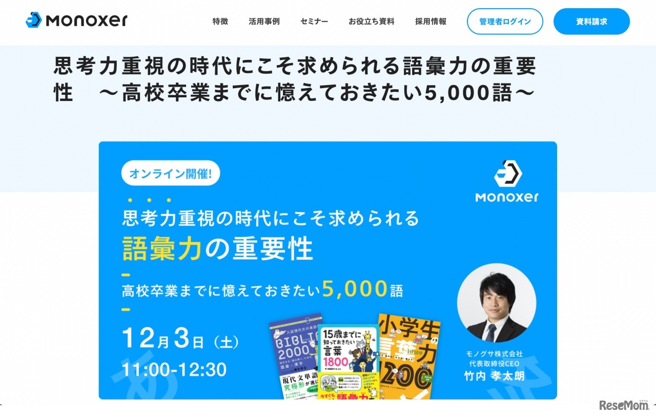 学習者の記憶定着をサポートする学習サービス「Monoxer」を提供するモノグサは2022年12月3日、教育関係者対象のセミナー「思考力重視の時代にこそ求められる語彙力の重要性~高校卒業までに憶えておきたい5,000語~」をオンライン開催する。参加無料。