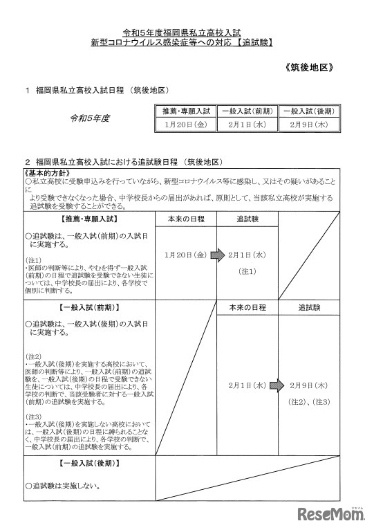 福岡県私学協会は2022年11月30日、2023年度私立高校入試において、新型コロナウイルス感染症等への対応として追試験を実施することを公表した。同感染症がいまだ収束していないことから、前年度に引き続き実施する。