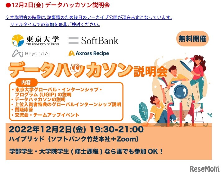 ソフトバンクは東京大学と共同で、東京大学の学生を対象に2023年2月1日から3月1日まで「集え次世代のグローバルAI人材!実社会のデータでAI活用ハッカソン」(データハッカソン)を開催する。参加費無料。参加受付を2022年12月2日に開始する。