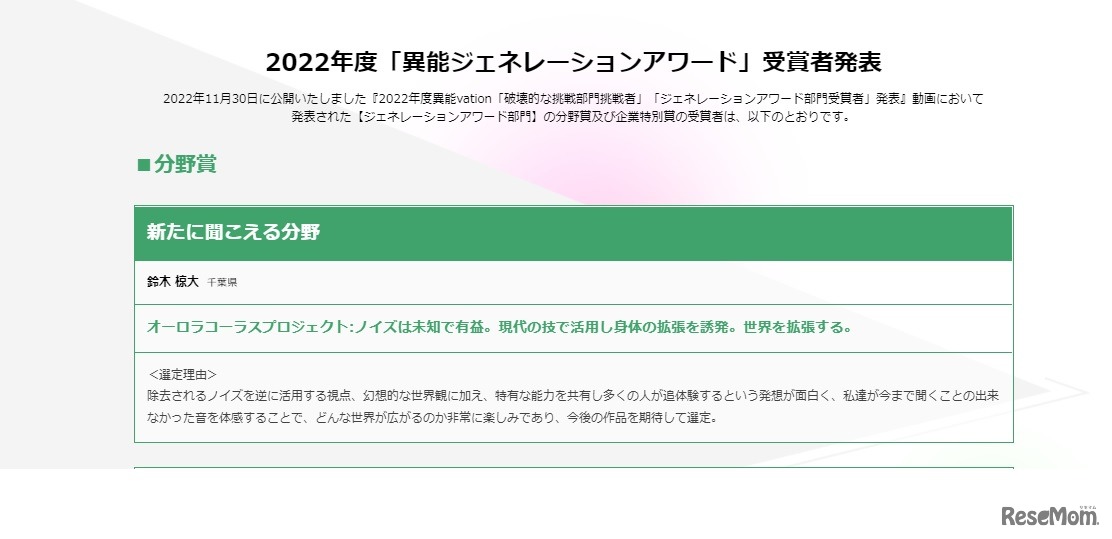 画像出典:異能vation 2022年度「ジェネレーションアワード」部門、分野賞の一部