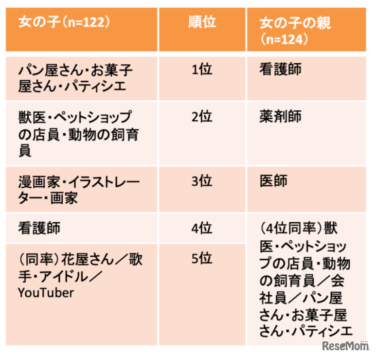 画像出典:こどもりびんぐ 女の子の希望職業と女の子の親がなってほしい職業