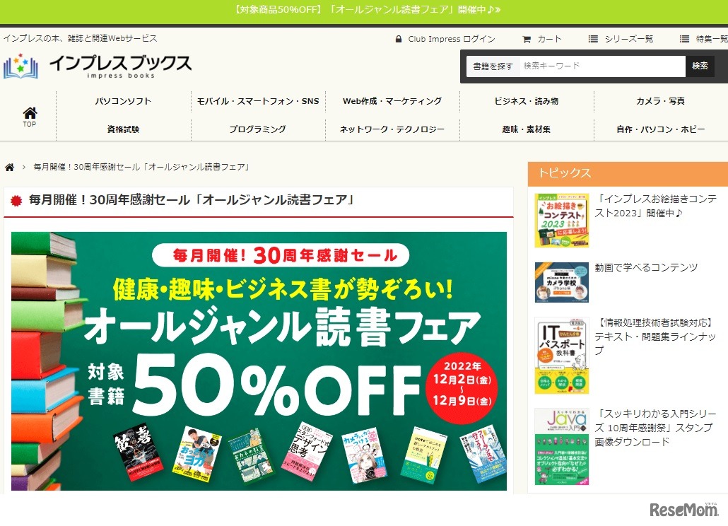 インプレスグループのIT関連メディア事業を展開するインプレスは、「オールジャンル読書フェア」を、2022年12月2日から9日まで実施する。インプレスグループ創設30周年を記念した電子書籍のセール「毎月開催! 30周年感謝セール」の第6弾となる。
