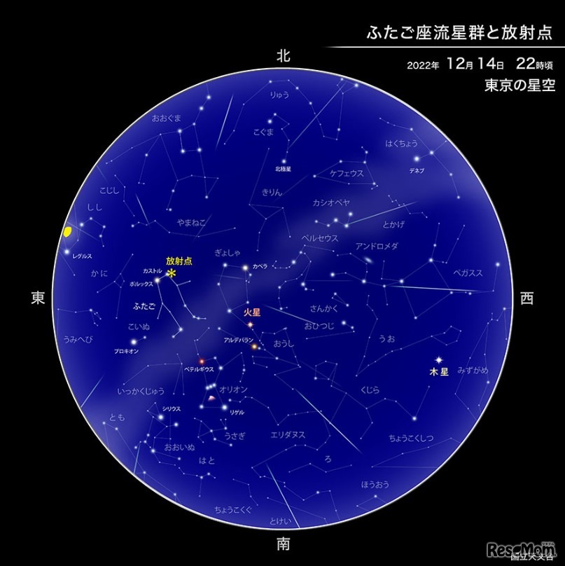 2022年のふたご座流星群の活動は、12月14日ごろに極大を迎える。ピーク予想時刻は14日の午後10時ごろ。13日夜~14日明け方、14日夜~15日明け方の2夜がチャンスだが、深夜は月明かりの影響を受けるため、夜半前の時間帯がお勧めだという。