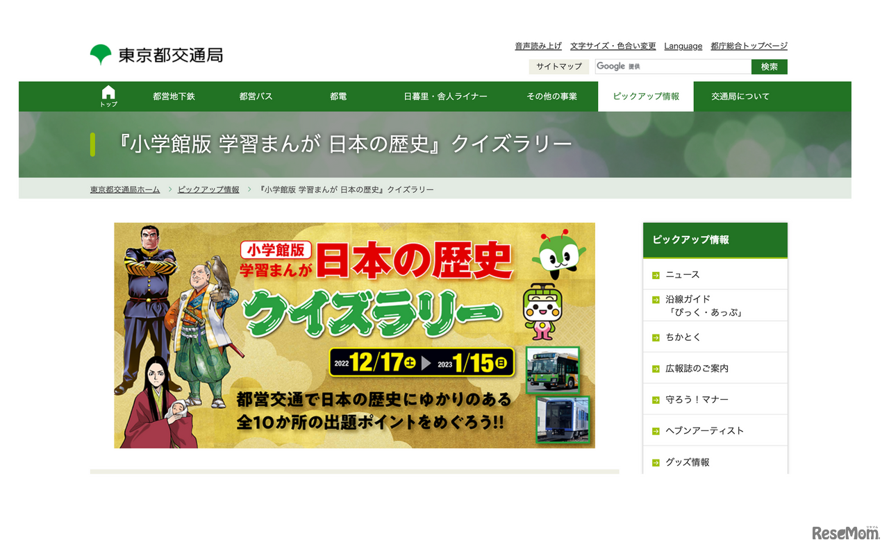2022年8月、東京都交通局は開局111周年、小学館は創立100周年を迎えた。この2つの周年を記念し、受験シーズンが到来する直前の12月17日から、日本の歴史にゆかりのある都営交通の駅等をめぐる「日本の歴史クイズラリー」を開催する。期間は2023年1月15日まで。