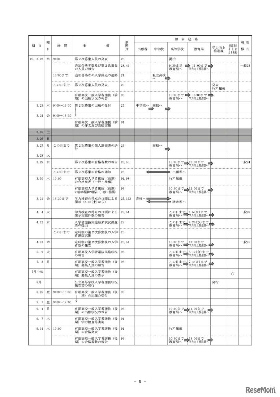 令和5年度(2023年度)道立高等学校入学者選抜に関する日程表