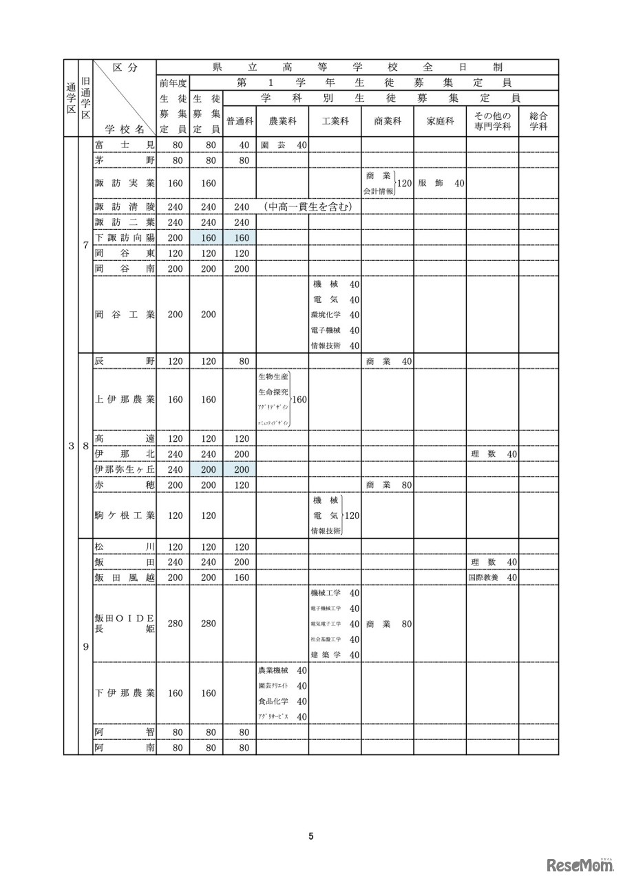 画像出典:長野県教育委員会 令和5年度長野県公立高等学校募集定員【全日制】