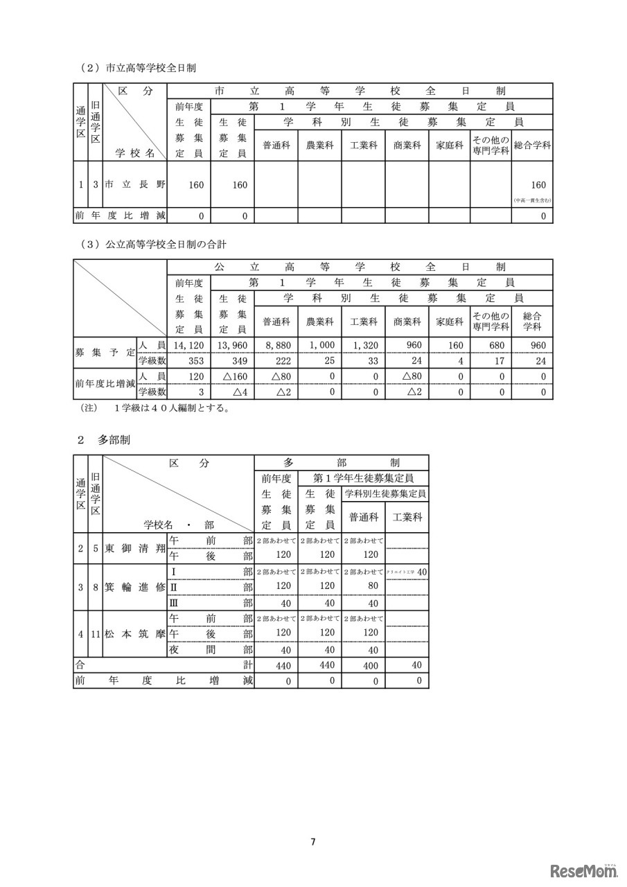 令和5年度長野県公立高等学校募集定員【全日制】【多部制】
