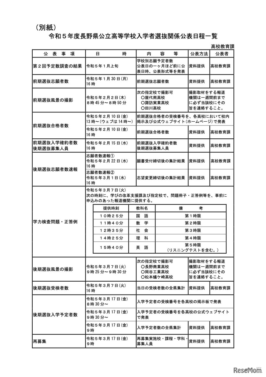 令和5年度長野県公立高等学校入学者選抜関係公表日程一覧