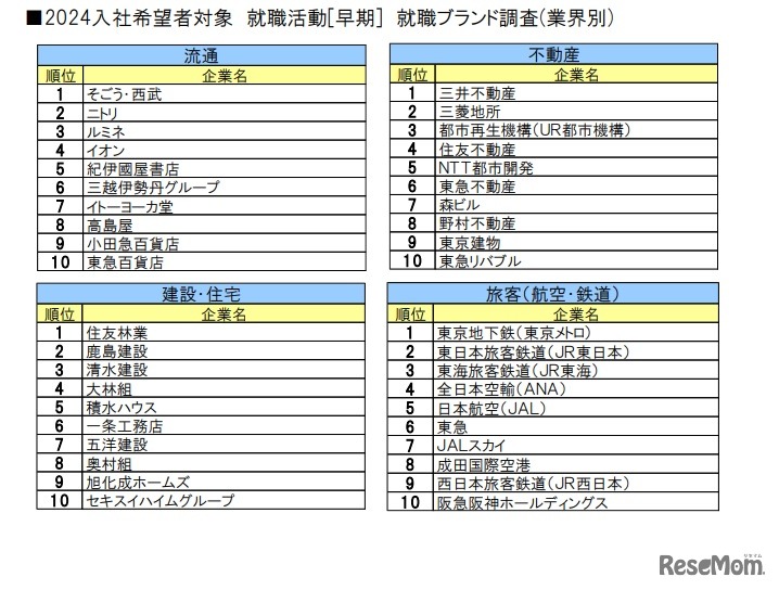 文化放送キャリアパートナーズは「2024入社希望者対象 就職活動(早期)就職ブランドランキング調査」の業界別順位を発表した。金融、商社、マスコミ、通信IT等、13業種別にランキングを発表。日本生命保険、伊藤忠商事、博報堂他、人気企業がランクインした。