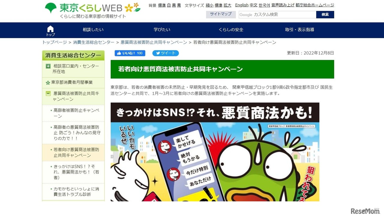 東京都は2023年1月~3月、若者の消費者被害の未然防止・早期発見を図るため、関東甲信越ブロックと共同でキャンペーン事業を実施する。ポスター・リーフレットの配布や、特別相談「若者トラブル110番」等を行う。
